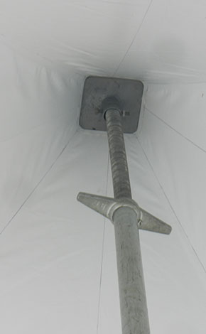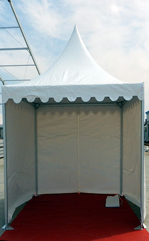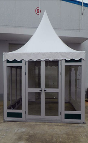 尖頂篷房系列尺寸有3×3米、4×4米,邊高是2.5米,采用二槽的48×84×2.5㎜鋁合金管材做支架。5×5米、6×6和10×10米的尖頂篷房標(biāo)準(zhǔn)邊高是2.5米,用四槽的48×105×3.5㎜鋁合金型材做支架,抗風(fēng)速80公里/小時。