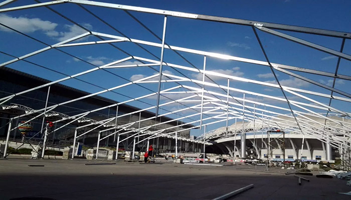 這些問題,對于高山環(huán)保篷房來說“都不是事”——首先高山環(huán)保系列篷房的跨度可以根據(jù)需要做到50米以上,邊高在15米以上,頂高20米以上,可以開口安裝巨型大門,吊車、重卡等大型裝備輕松進出。更寶貴的是內部無梁無柱,盡可輾轉騰挪,大大提高工作效率。