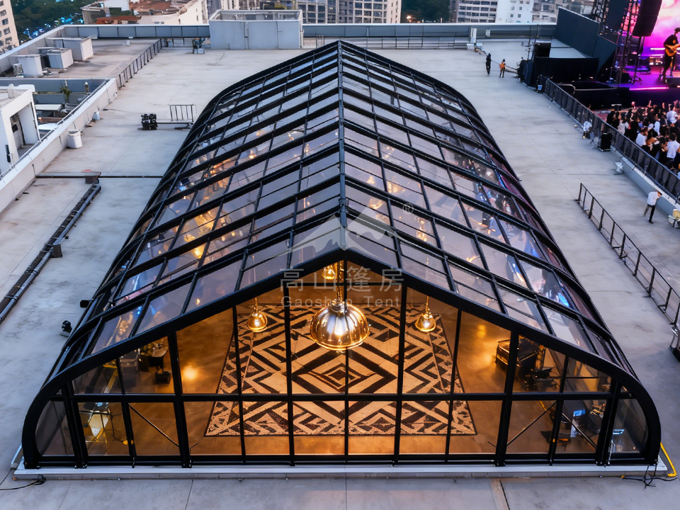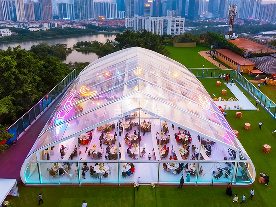 桃型篷房的弧形頂設(shè)計(jì)借鑒了房屋屋頂?shù)牧骶€型理念,外觀優(yōu)雅時(shí)尚,線條流暢如跳動(dòng)的音符,能有效吸引目光,提升活動(dòng)格調(diào)。其弧形結(jié)構(gòu)不僅是為了美觀,更蘊(yùn)含空氣動(dòng)力學(xué)智慧,可增強(qiáng)抗風(fēng)能力,避免傳統(tǒng)四角篷房易受風(fēng)力影響的弱點(diǎn)。篷房?jī)?nèi)部采用無柱大跨度設(shè)計(jì),空間利用率高,可根據(jù)活動(dòng)需求靈活布局,無論是展覽、婚禮還是商業(yè)促銷,均能提供開闊且無障礙的場(chǎng)地。