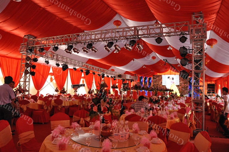 高山篷房還可量身定制進(jìn)行篷房的布置和提供配套服務(wù)。篷房?jī)?nèi)的空調(diào)、地板、燈光等為基本配置,高山還能用布幔、擺設(shè)等將其布置成五星級(jí)酒店大廳,并提供舞美、表演、樂(lè)隊(duì)等配套服務(wù)。
